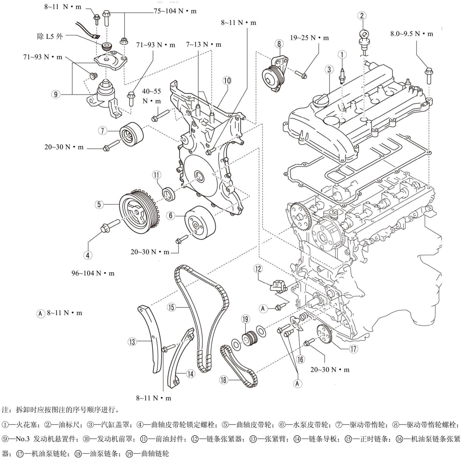 L8/LF/L5型发动机正时系统部件如图2-1所示。发动机正时系统部件名称见图注。