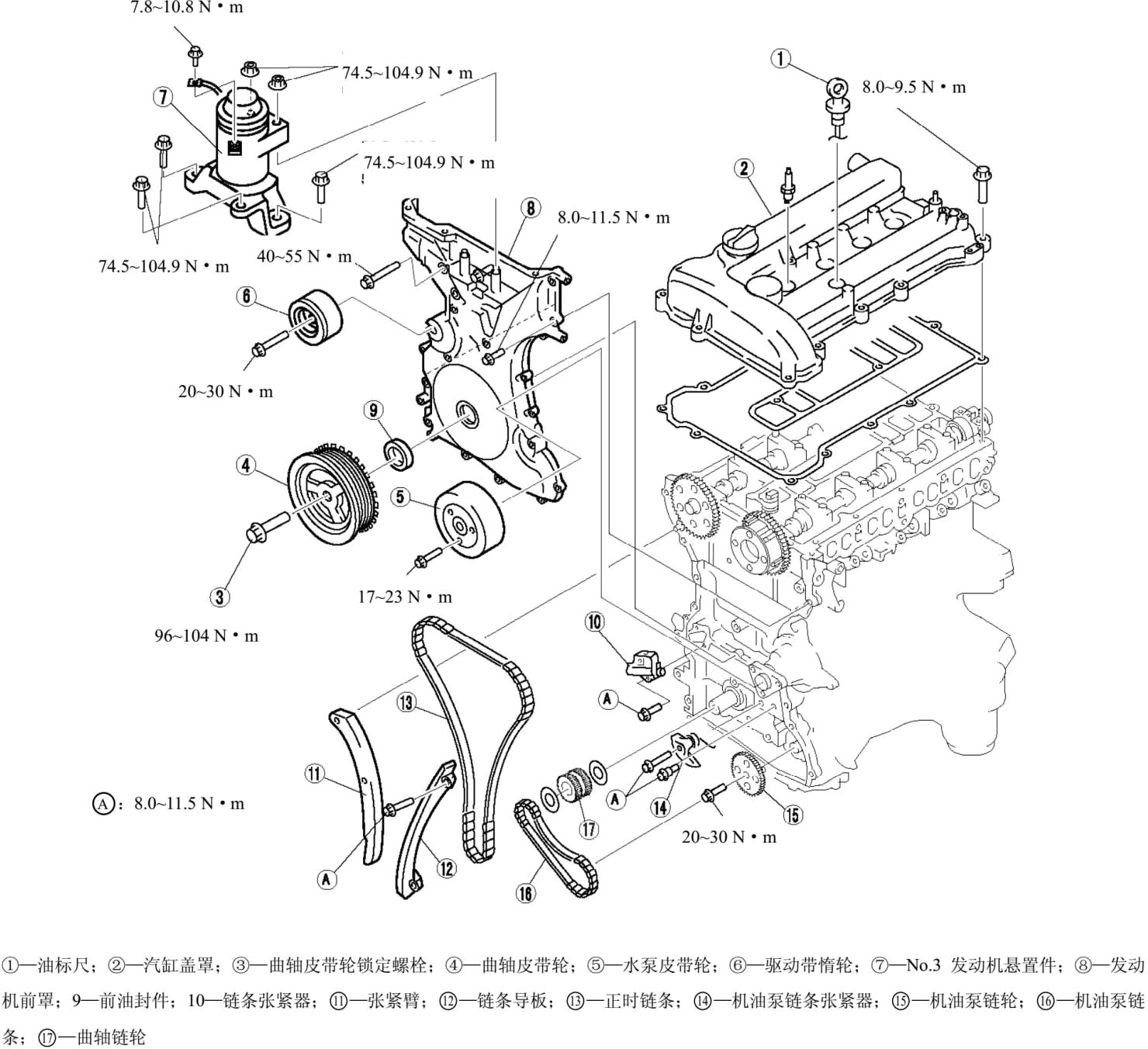 12. 按图2-2所示的发动机正时部件的图注序号顺序进行拆卸。