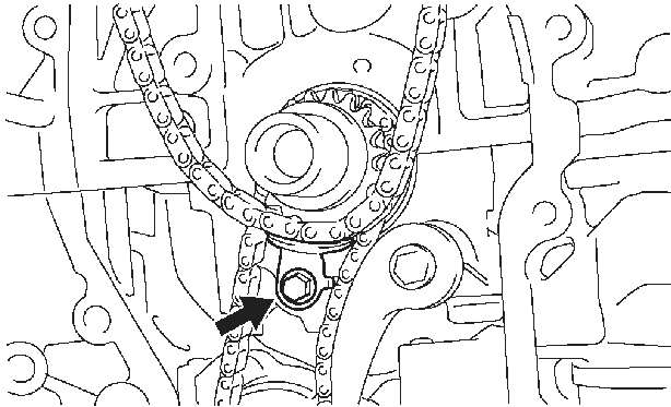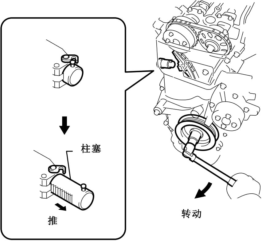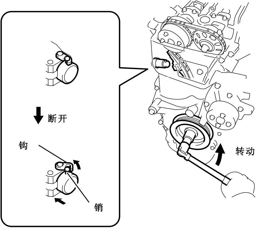 注意:在安装链条张紧器时,如果卡钩从柱塞上松开,则重新设置卡钩。