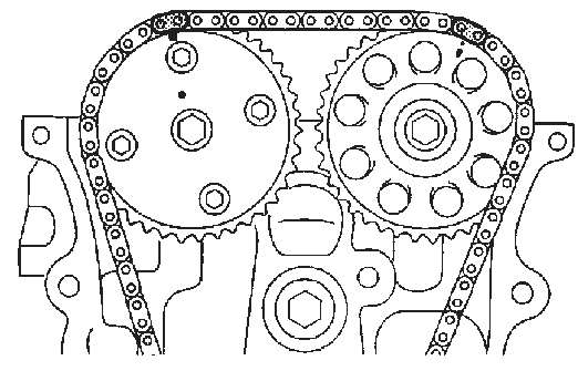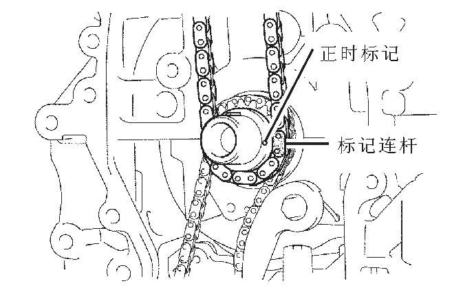 (4)将金色或黄色标记连杆对准凸轮轴正时齿轮和链轮上的各正时标记,然后安装链条,如图1-34所示。