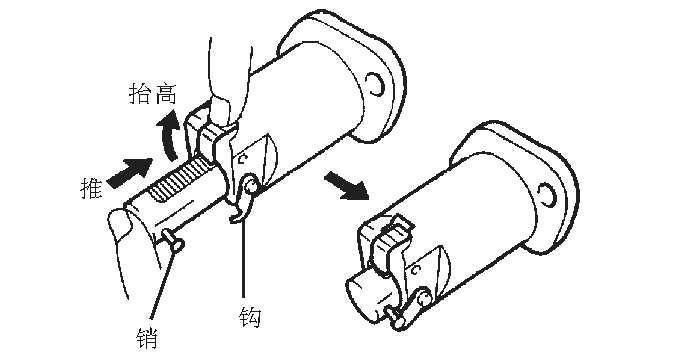 (1)松开棘轮爪,然后将柱塞完全推入并将卡钩钩住销,以使柱塞保持在如图1-45所示位置。