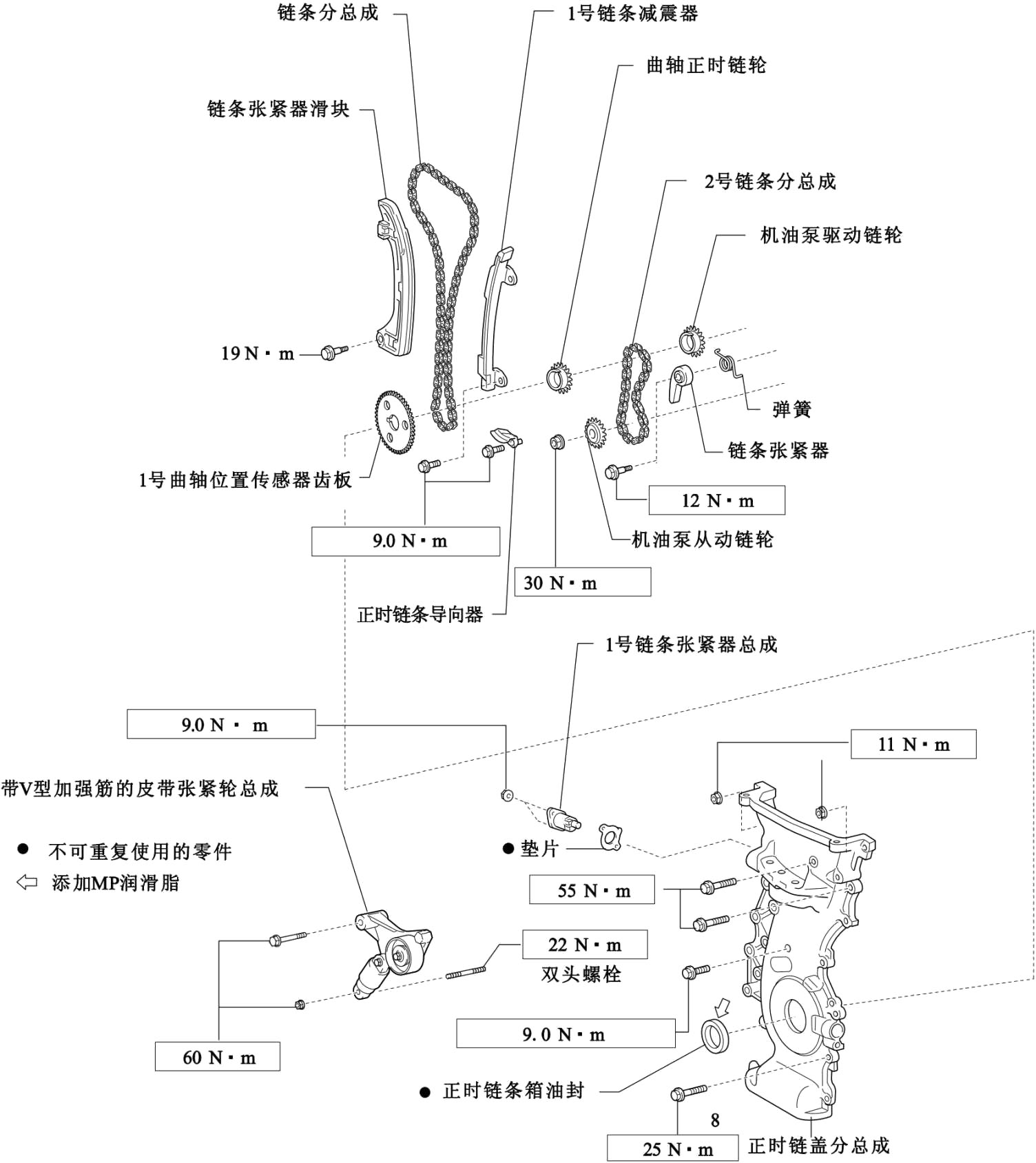 1AZ—FE型和2AZ—FE型发动机正时系统部件如图1-1所示。