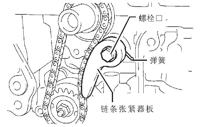 (3)拆卸螺栓、链条张紧器板和弹簧,如图1-21所示。