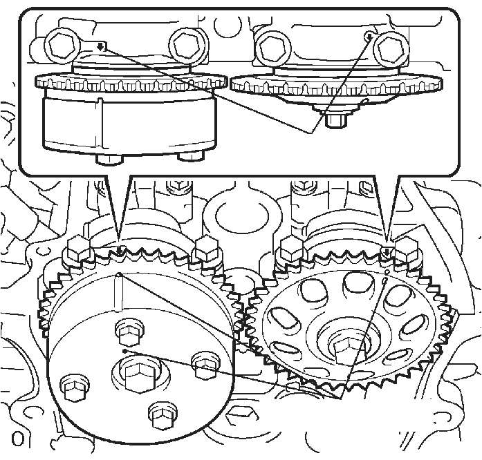 ① 用扳手转动凸轮轴(使用六角顶部),使凸轮轴正时齿轮的各正时标记与1号以及2号轴承盖上的各正时标记均对准,如图1-30所示。
