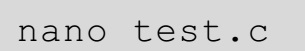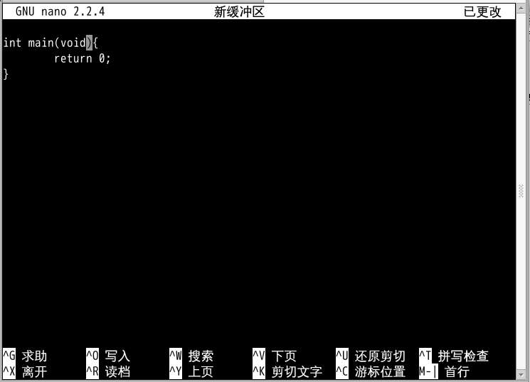 这样就可以打开一个test.c文件,并进入文本编辑的页面中了。在写入适当的内容之后,按下“Ctrl+O”组合键可以保存文件,按下“Ctrl+X”组合键可以退出页面。