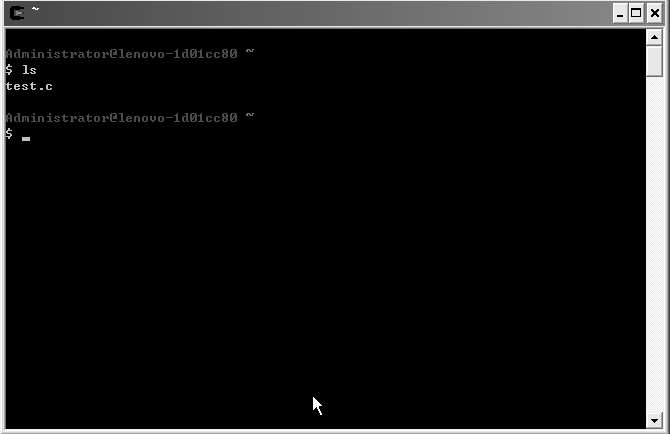 保存完成后,运行Cygwin,并在弹出的命令行中输入“ls”这条命令,可以看到test.c文件出现在该目录下,如图1-12所示。
