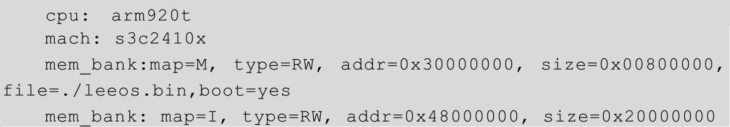 接下来的mem_bank关键字描述的是芯片内存空间特性。其中,map=M代表该段内存空间是一段内存,而如果是map=I,则代表该内存空间对应的是外设端口。type=RW表示的则是该内存空间具备可读写属性。之后的addr=0x30000000和size=0x00800000分别代表内存空间的起始地址和大小,这里,我们将虚拟开发平台配置为拥有8M内存并开始于0x30000000处。后面的file=./leeos.bin表示的是预先要被加载到这段内存空间的映像文件。而boot=yes则表示默认从此处启动。有了这两个属性,在操作系统调试或运行时就不必关心程序的引导,而可以直截了当地去运行了。需要注意的是,mem_back关键字之后的内容需要出现在一行里,由于版面的原因,这里被分成了两行。