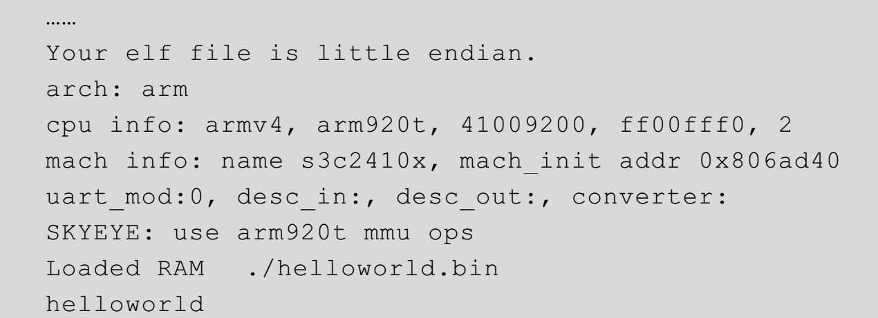 将上述内容保存成文件,名为“skyeye.conf”,与“helloworld.bin”文件放置在同一个目录下。在终端运行skyeye命令,就会看到如下结果。