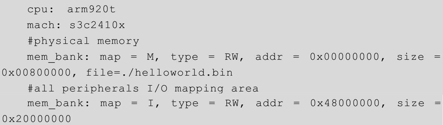 接下来我们需要根据程序的编译情况来编写一个SkyEye的配置文件,其内容如下。
