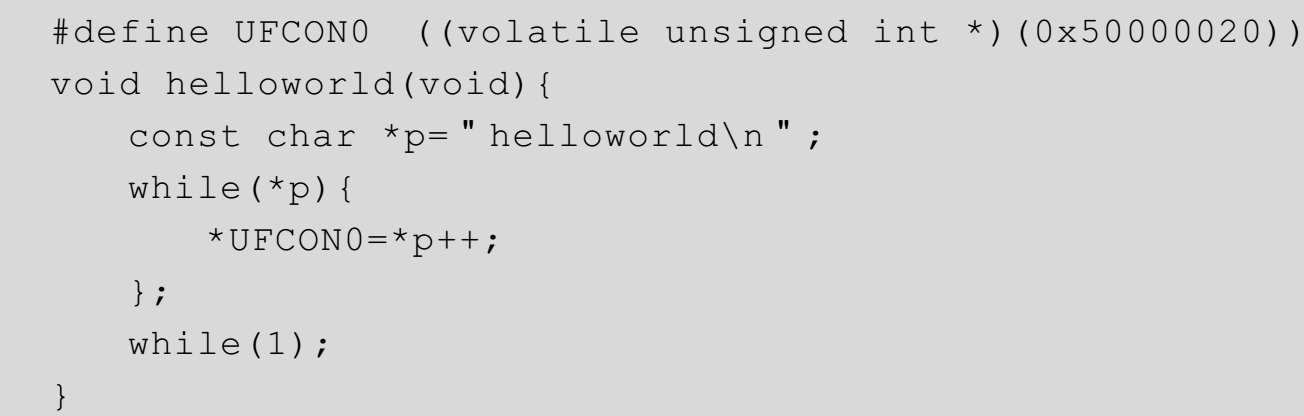 程序简单到无须介绍,这里只需要说明一点,物理地址0x50000020代表的是s3c2410的串口FIFO寄存器地址,简单地说,就是写向该地址的数据都将会通过串口发送给另一端。这段程序只是串行的将字符串“helloworld”依次送给串口FIFO寄存器。我们将以上内容保存成文件,命名为“helloworld.c”。