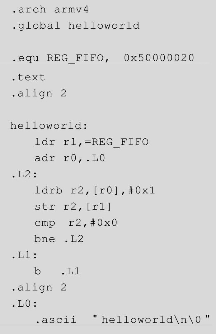 代码2-5就是helloworld程序的汇编版本。想要让读者理解这段程序,我们并不需要对ARM的汇编程序设计进行太过系统的介绍,我们只需要说清楚两点,一是寄存器,二是指令集。