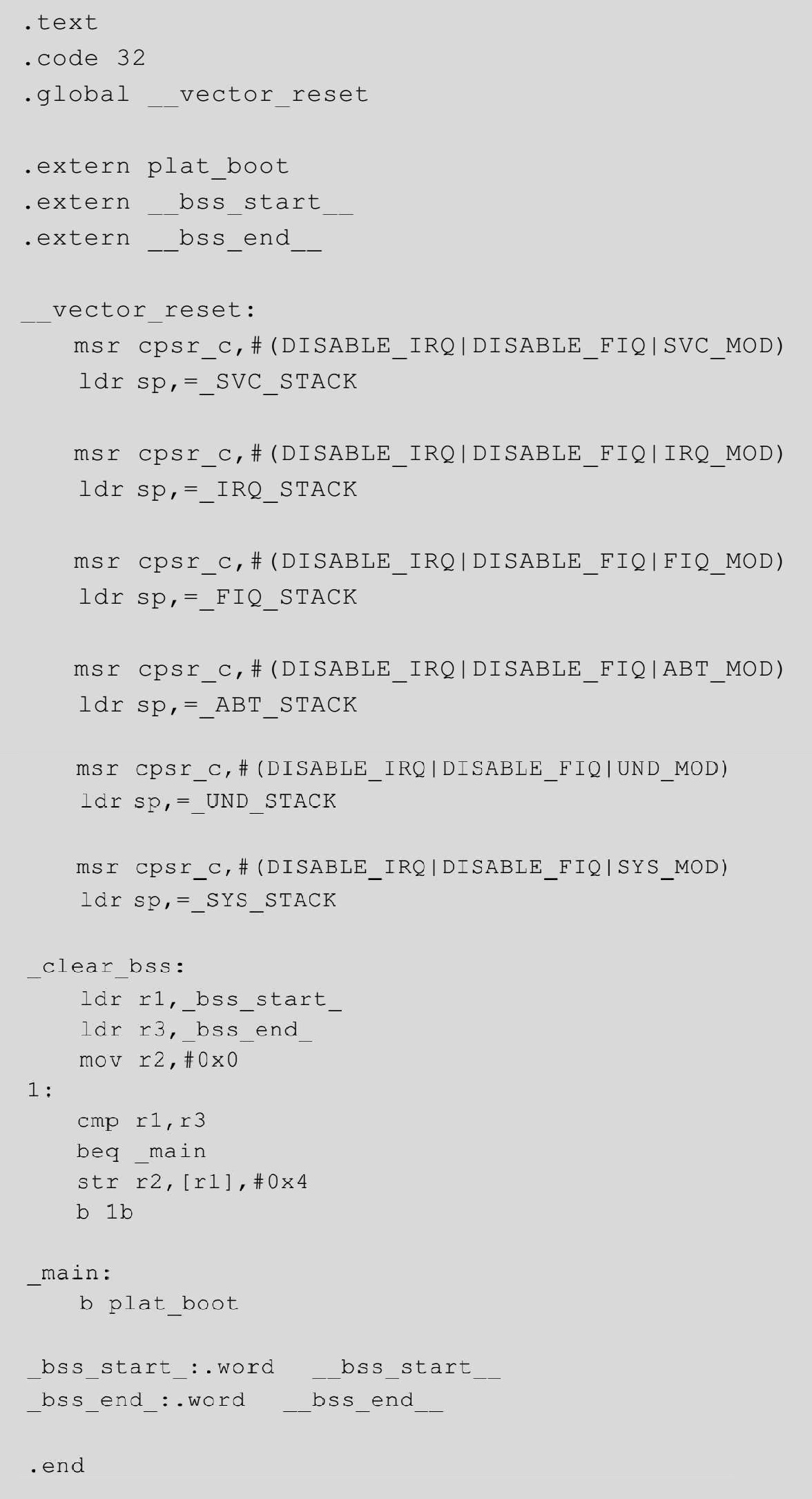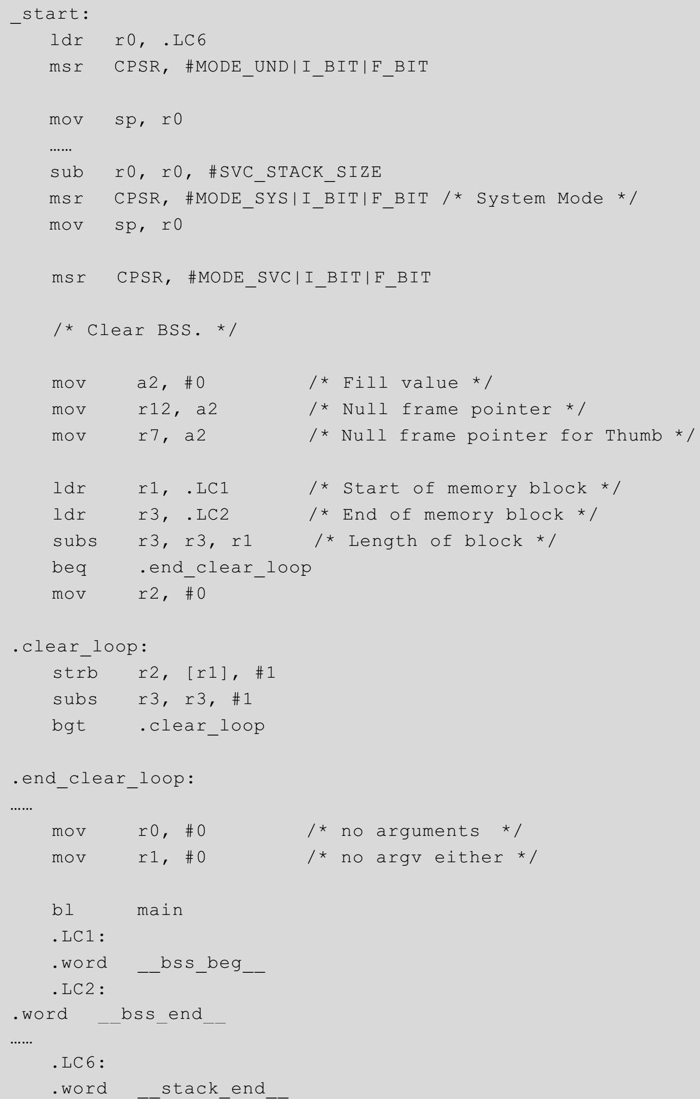 代码3-2从_start处开始,一步步进行栈指针和bss段的初始化工作,最终通过一条bl指令跳转到主程序处继续运行。示例代码删减了相对重复和不具有代表性的内容,以使代码结构更清晰。