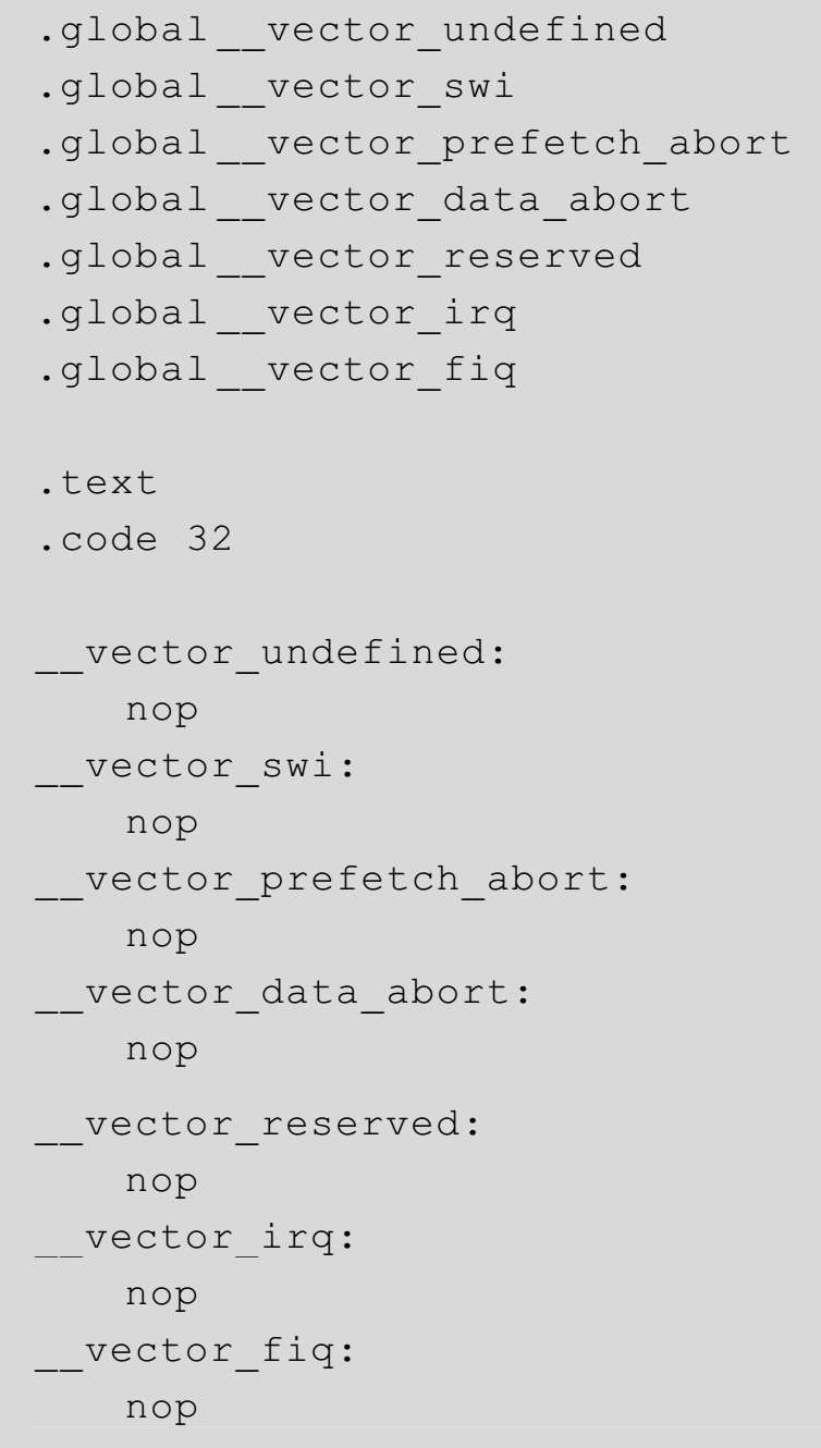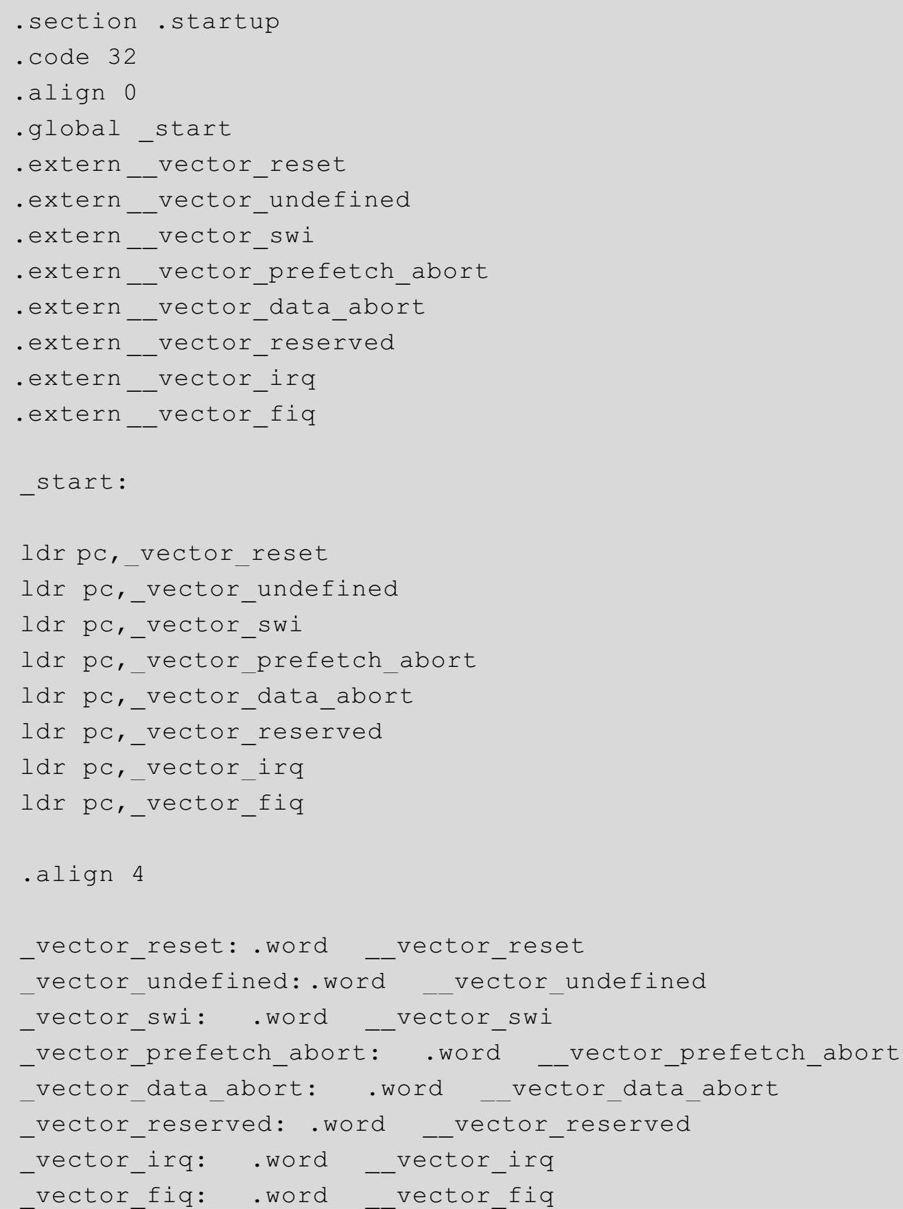 接下来,代码3-1将执行该程序的第一条指令—跳转指令,通过该指令程序将直接跳转至_start处继续运行。既然如此,紧接着跳转指令的其他指令在什么情况下才能运行呢?熟悉ARM体系结构的读者可能清楚,包括第一条指令在内,这段代码正是异常向量表。也就是说,所有其他指令都会在异常模式发生时才会运行。
