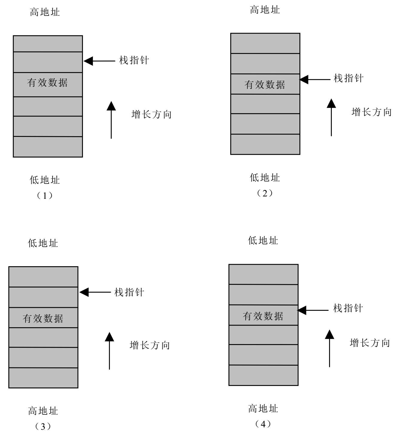 图3-1直观地描述了这两个问题的四种组合情况,所谓堆栈如何增长,指的是堆栈指针更新时,是向着高地址方向还是低地址方向,而所谓满堆栈和空堆栈,指的是当程序利用堆栈指针向堆栈中存储数据或从堆栈中提取数据时,是先将数据存入或读出再更新堆栈指针还是先更新堆栈指针,然后再存取数据,也就是说,当前堆栈指针是否指向了有效数据。因此,堆栈的处理方法可以总结为四种,分别为空递增堆栈、满递增堆栈、空递减堆栈、满递减堆栈。读者可以将这四种处理方法在图3-1中一一对号入座。
