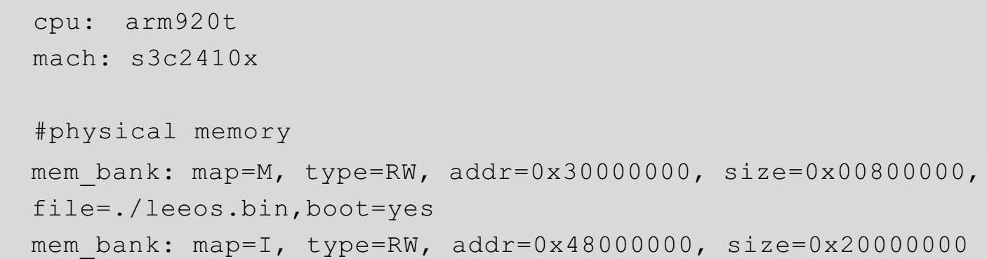 因为在代码中,我们已经假设内存起始于地址0x30000000处,大小为0x00800000。为保证代码能够成功运行,我们必须虚拟出一块内存,起始位置和大小恰与代码一致。