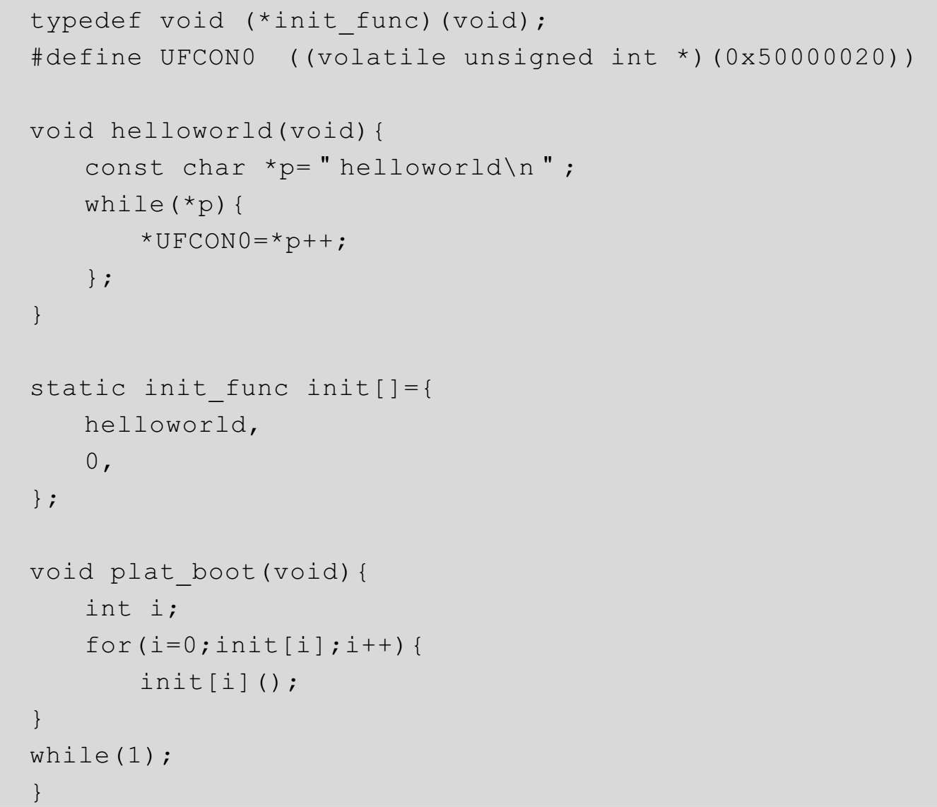 由于操作系统在设计之初就兼顾了自身的可移植性,因此,板载硬件的初始化工作对于不同的平台,虽然毫无相同之处,但却必须要追求一种统一。这种不同平台的统一其实是一种抽象,在程序设计当中,好的抽象能够以最高的效率、通过最少的代码修改实现最大程度的兼容,可以说软件设计能力其实就是一种抽象能力。可能有些读者会觉得我的这段话也很抽象,那就让我们直接看代码,体会一下抽象软件设计的优势吧。