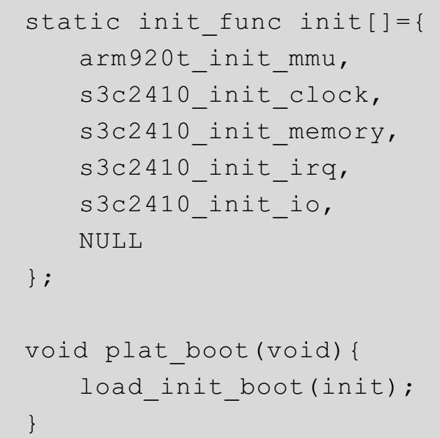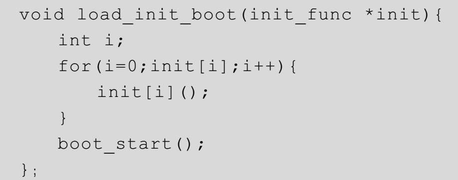 从定义中我们可以看出,init_func类型的函数既没有参数也没有返回值。初始化函数不需要参数,是因为它们只需要被调用一次,并不需要通过参数的动态改变来执行内容,也不需要返回值,因为这些函数都不允许执行失败,即便能够返回执行失败的结果,在初始化阶段也没有能力补救。但不管怎样,正是init数组中的各个成员函数完成了对各种硬件的具体的初始化工作。在plat_boot函数中,将init数组作为参数传递给了load_init_boot函数,而该函数便是这个数组成员函数的实施者,让我们来看一下这个函数的具体实现: