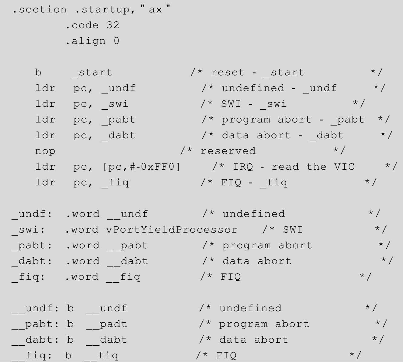 这一段代码节选自开源嵌入式操作系统freeRTOS的初始化部分,与该段代码类似的初始化方式广泛应用于支持ARM的各种类型的操作系统和引导程序中,因此非常具有代表性。