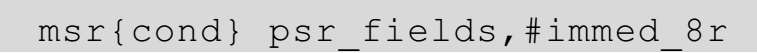 回到代码3-2中,R0被赋值之后,紧接着程序通过一条msr指令更改当前处理器模式为未定义指令模式。在ARM的7种处理器模式中,除用户模式和系统模式共用一个R13寄存器外,其他异常模式都有独立的R13寄存器,这表示各模式的堆栈是彼此独立的。同时,因为不同模式之间的私有寄存器不能够互相访问,因此,想要对不同模式的R13寄存器分别进行初始化,必须首先切换到相应模式中,然后再对R13寄存器赋值。而msr指令便能实现模式切换,其完整格式如下。