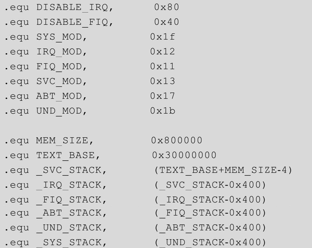 另一类宏定义则是与内存有关的。根据2410的芯片手册,外部sdram可以接在起始地址为0x30000000的位置上,我们虚拟的内存便是从这一地址开始的,并假设内存总容量为8M。这样,我们选取SVC模式堆栈的最顶端为内存的最后一个字节(即0x30000000+0x800000-4),并给其分配1K的堆栈空间供该模式使用,其他模式的堆栈空间大小同样为1K,位置依次排列。我们将代码3-9与代码3-4的内容保存成文件,命名为“init.s”。