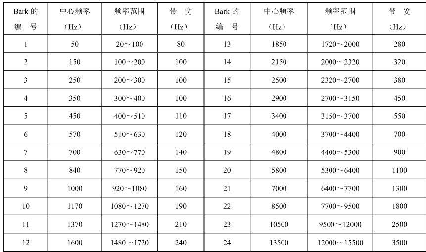 噪声的存在也会影响到纯音的接收,即对纯音产生掩蔽。可以把噪声视为由许多纯音组成的宽带音。掩蔽作用最明显的是被掩蔽纯音的频率附近的一个窄带的掩蔽分量。因此,人们常用“频率群”掩蔽的概念来解释。为了描写这种掩蔽的效果,人们引入了临界带宽的概念。一个纯音可以被以它为中心频率,且具有一定频率带宽的连续噪声所掩蔽,如果在这一频带内噪声功率等于该纯音的功率,这时该纯音处于刚能被听到的临界状态,即称这一带宽为临界带宽。一个临界带宽可以用巴克(Bark)来表示。在20Hz~16kHz范围内的声音可以分为24个频率群,或者说共有24个巴克(Bark)。表2-3给出了24个临界带宽的编号、中心频率、频率范围及其带宽的数据。