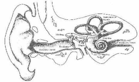 外耳是听觉器官的第一层。外耳虽然比较简单,但在听觉系统中起着重要的作用。如果没有外耳,耳朵的听觉就不会那么灵敏,许多声音就可能听不到。外耳由耳廓、外耳道和鼓膜组成。成年人的外耳道长约为2.7cm,直径约为0.7cm。外耳道封闭时的最低共振频率约为3060Hz。由于外耳道的共振效应,会使声音得到10dB左右的放大。一般认为外耳在对声音的感知中有两个作用,即声源的定位和对声音的放大。除了外耳道的共振可使声音放大之外,头的衍射效应也会增加鼓膜处的声压,可使声音放大约20倍。