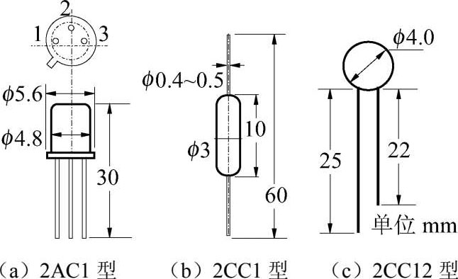如图 1-26 所示为 2AC1、2CC1、2CC12 型变容二极管的外形及尺寸,表 1-10 至表 1-12 列出了部分变容二极管的主要参数,供读者参考。