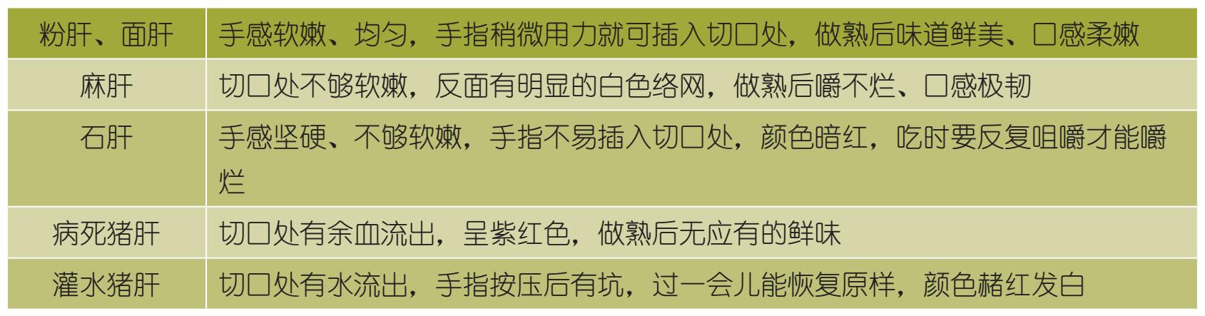 猪肝分为粉肝、面肝、麻肝、石肝、病死猪肝、灌水猪肝。粉肝、面肝属于优质猪肝,麻肝、石肝质量不及前两种,病死猪肝、灌水猪肝则属于劣质品,即使高温烹调也不能保证完全杀死细菌,不能给宝宝食用。