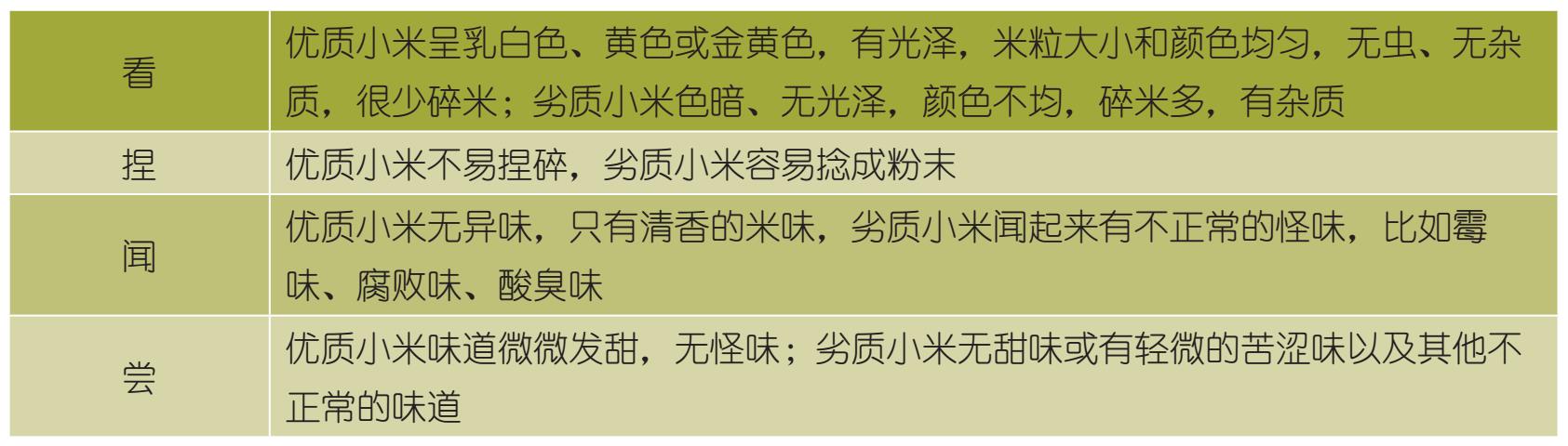 妈妈要警惕染色小米,可以用以下方法检验:取一张柔软的白纸,放上少许小米,用嘴哈气,使其变得湿润,然后用纸来回反复搓小米,观察纸上是否有轻微的黄色,如果有说明小米染了黄色素;妈妈也可以向小米中加少量清水,等待一会儿,观察水的颜色是否发生变化,如果微微发黄,说明小米被染色了。