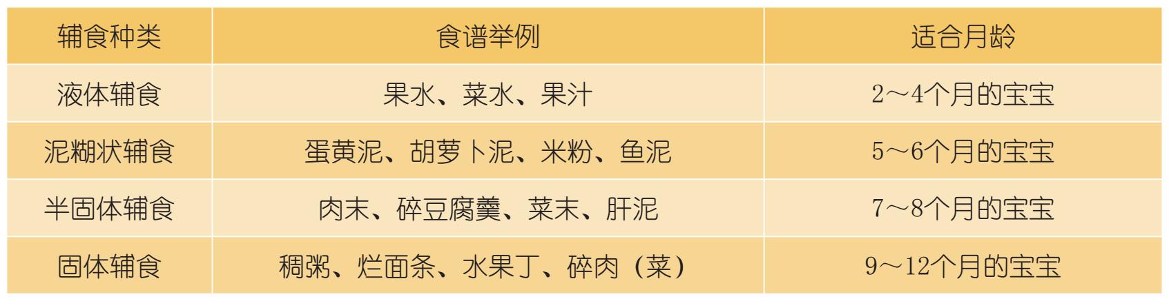 液体辅食主要指的是蔬菜水、果水、果汁一类无渣的液体食物,泥糊状辅食指的是米粉、藕粉、玉米粉、水果、蔬菜、肉类等食材制成的半流质辅食,半固体辅食则主要包括颗粒羹状和粥类辅食,固体辅食主要指比泥糊状成形但比成年人食物更为细软的食物。