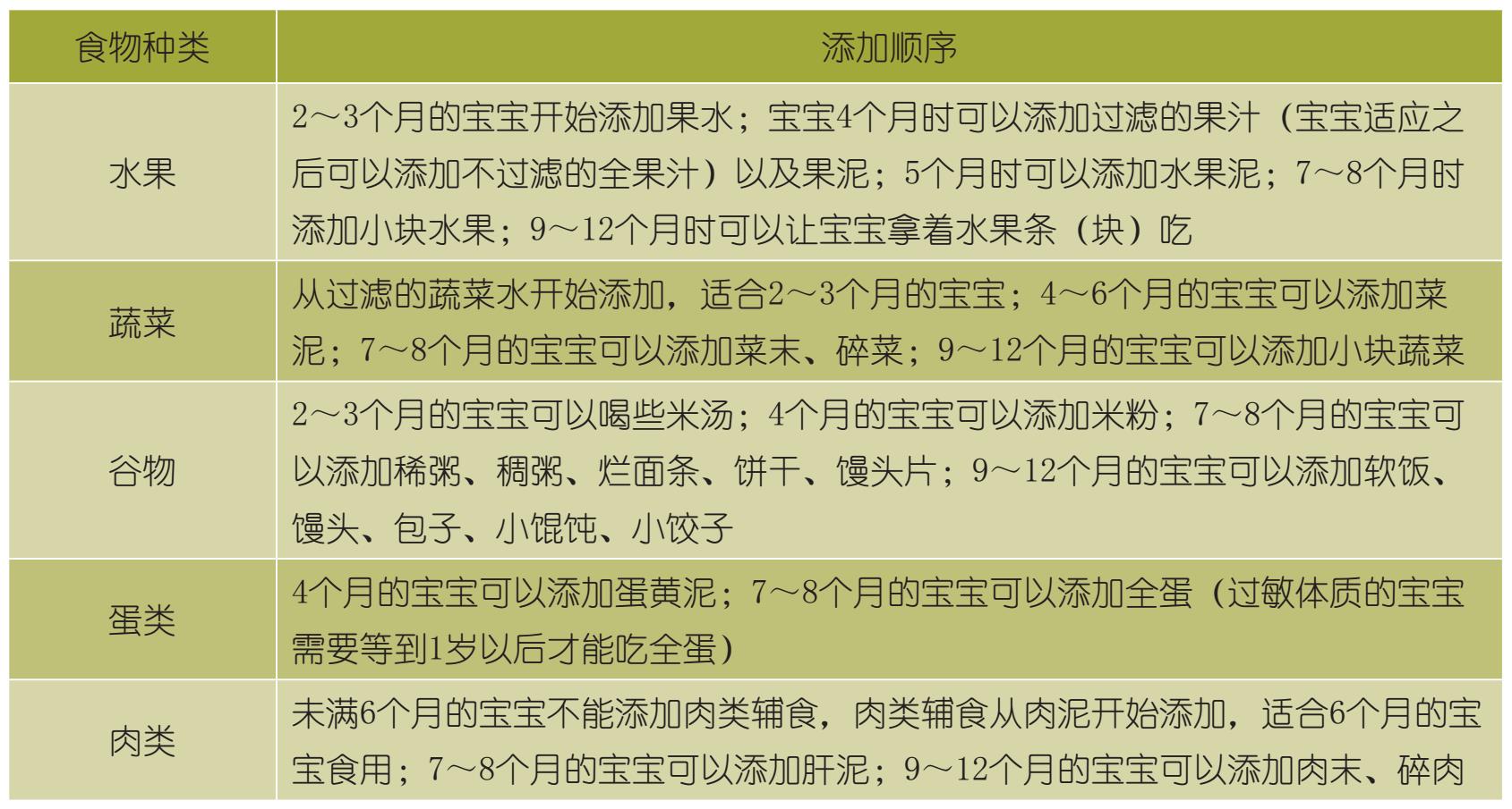 4个月的宝宝可以添加婴儿米粉、菜水、果水、蛋黄泥(加温开水调匀),5~6个月的宝宝可以添加泥糊状辅食,7~8个月的宝宝可以添加半固体辅食,9~12个月的宝宝可以添加固体辅食。