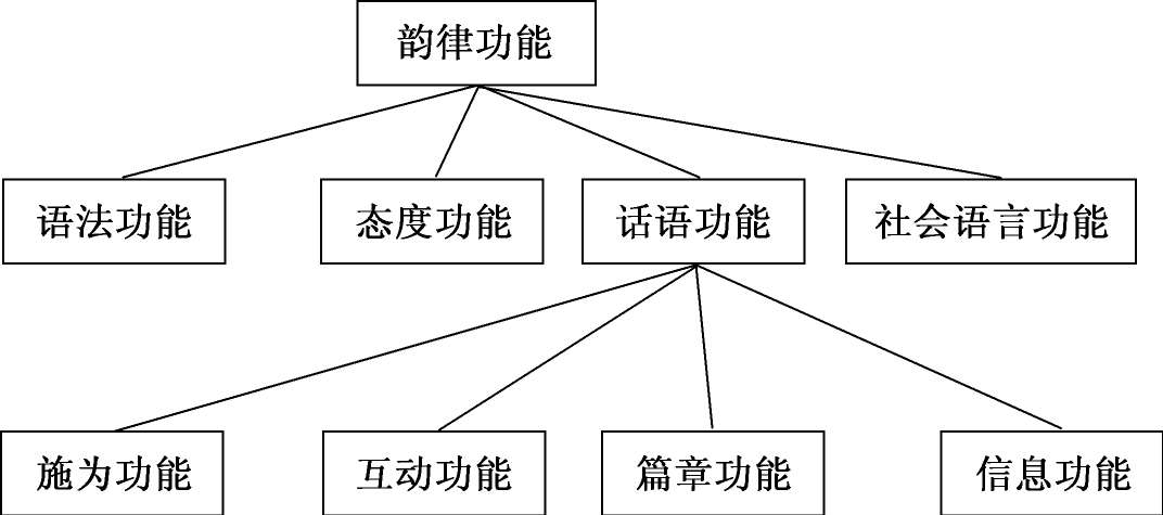 以往文献(Brazil,Coulthard&Johns,1980;Chun,2002;Couper-Kuhlen,1986)显示,韵律具有语法功能、态度功能、话语功能和社会语言功能(见图2.1)。韵律的话语功能包含帮助说话人实施言语行为的施为功能、进行会话管理的互动功能、保持命题连贯的篇章功能和强调焦点的信息功能。