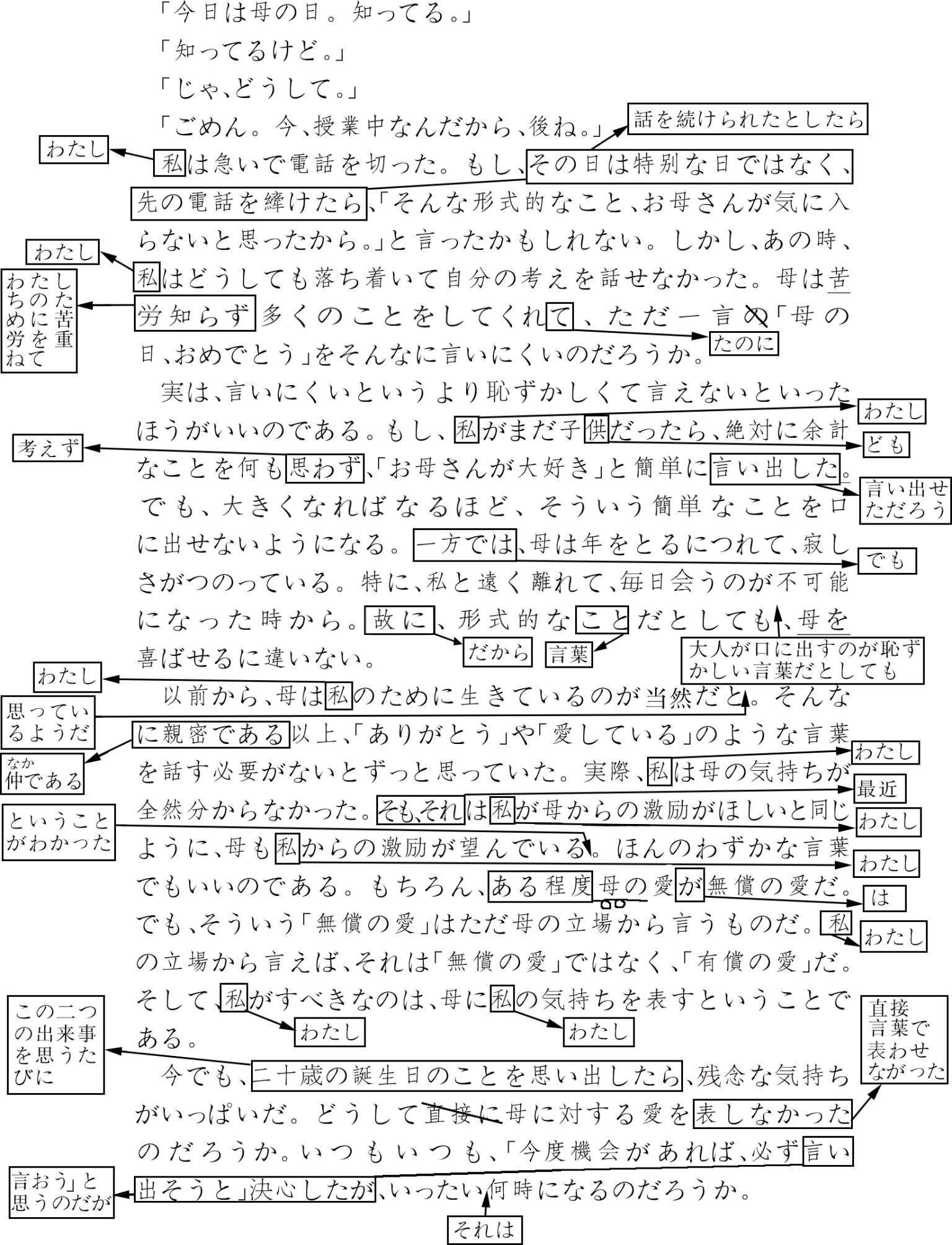 けられたとしたら、「そんな形式的なこと、お母さんが気に入らないと思ったから。」と言ったかもしれない。しかし、あの時、わたしはどうしても落ち着いて自分の考えを話せなかった。母はわたしのために苦労を重ねて多くのことをしてくれたのに、ただ一言「母の日、おめでとう」をそんなに言いにくいのだろうか。