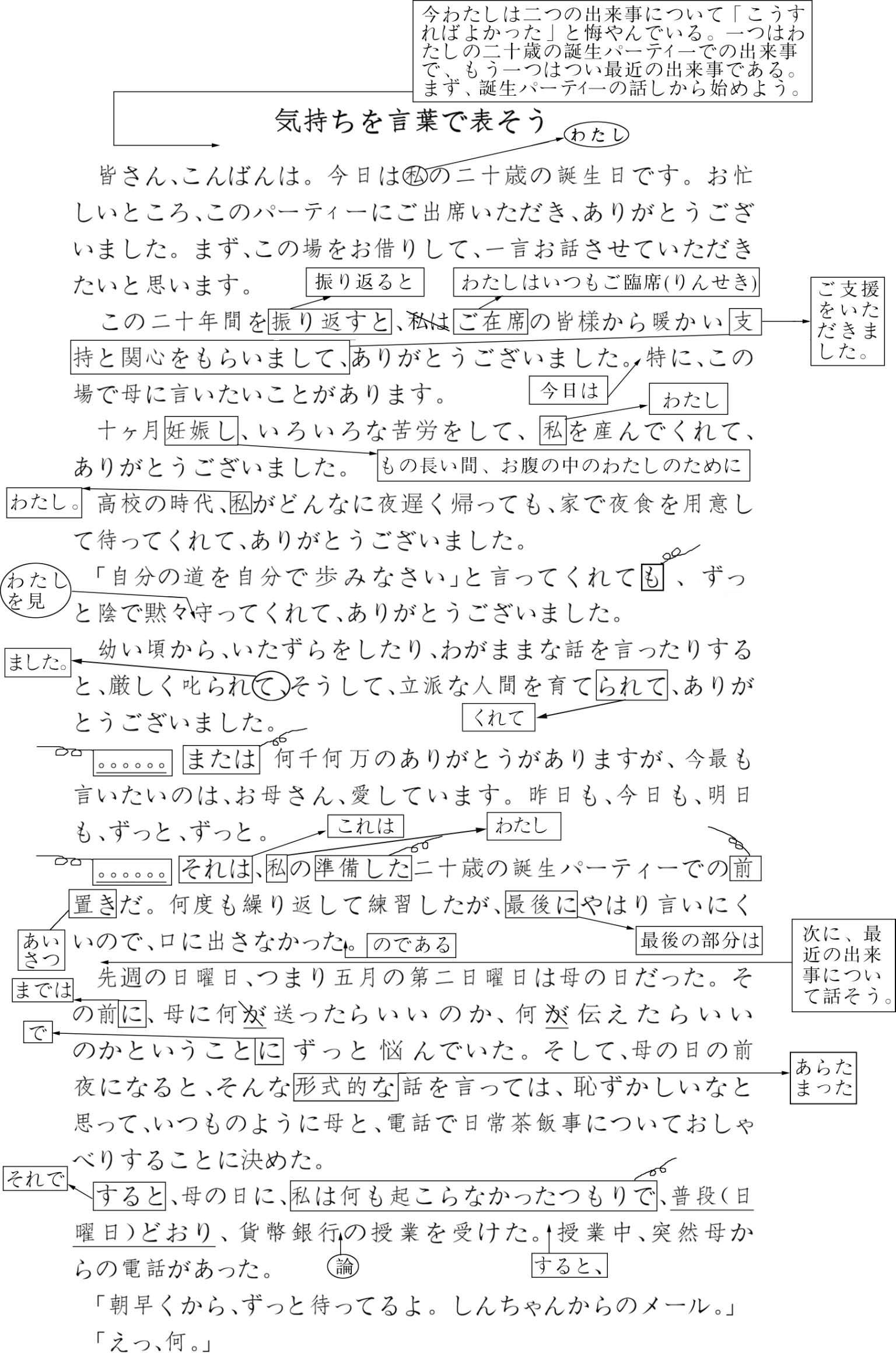 皆さん、こんばんは。今日はわたしの二十歳の誕生日です。お忙しいところ、このパーティーにご出席い た だ き、ありがとうございまし た。ま ず、この場をお借りして、一言お話させていただきたいと思います。