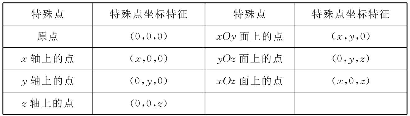 空间直角坐标系中坐标轴、坐标面上点的坐标特征列表如下(见表1-2):