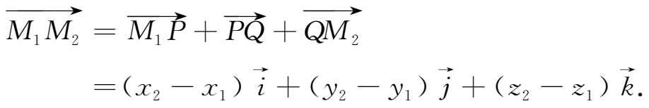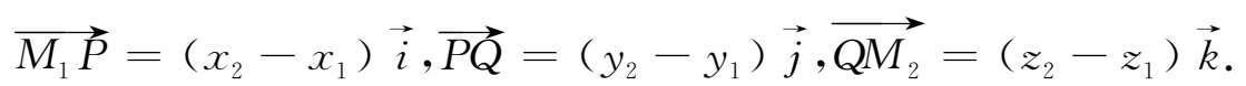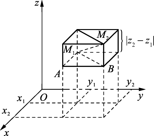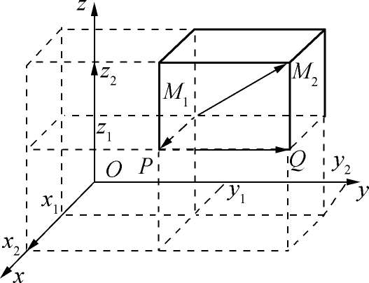 如图1-4所示,设 M 1 ( x 1 , y 1 , z 1 )、 M 2 (x 2 ,y 2 ,z 2 )为空间两点,过点M 1 、M 2 分别作垂直于三条坐标轴的六个平面,它们围成一个以 M 1 M 2 为对角线的长方体,其长、宽、高三条棱的长度分别为: