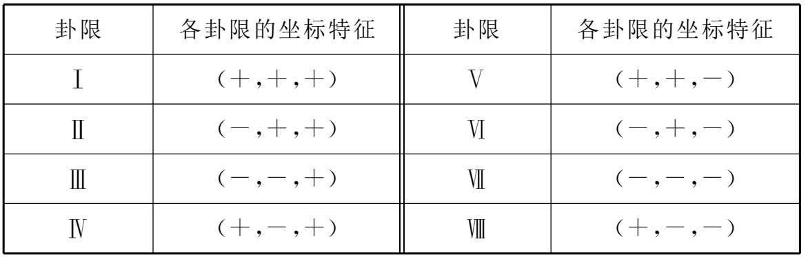 空间直角坐标系中八个卦限上点的坐标特征列表如下(见表1-1):