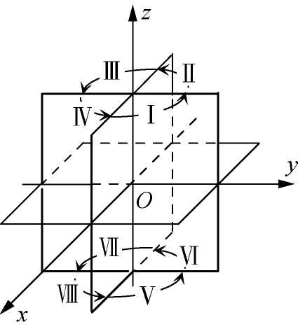 三个坐标面又将空间分成八个部分,各部分依次称为第Ⅰ,Ⅱ,Ⅲ,Ⅳ,Ⅴ,Ⅵ,Ⅶ,Ⅷ卦限,如图1-2所示,坐标面是卦限的界面,不属于任何卦限。