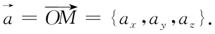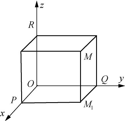 设点 M 为空间的一点,过点 M 分别作与三条坐标轴垂直的平面,交点分别为 P , Q , R (如图1-3),这三点在坐标轴上的坐标依次为 x , y , z ,则空间的点 M 唯一确定了一个三元有序数组( x , y , z ).显然,空间的点 M 与有序数组( x , y , z )之间建立了一一对应关系。