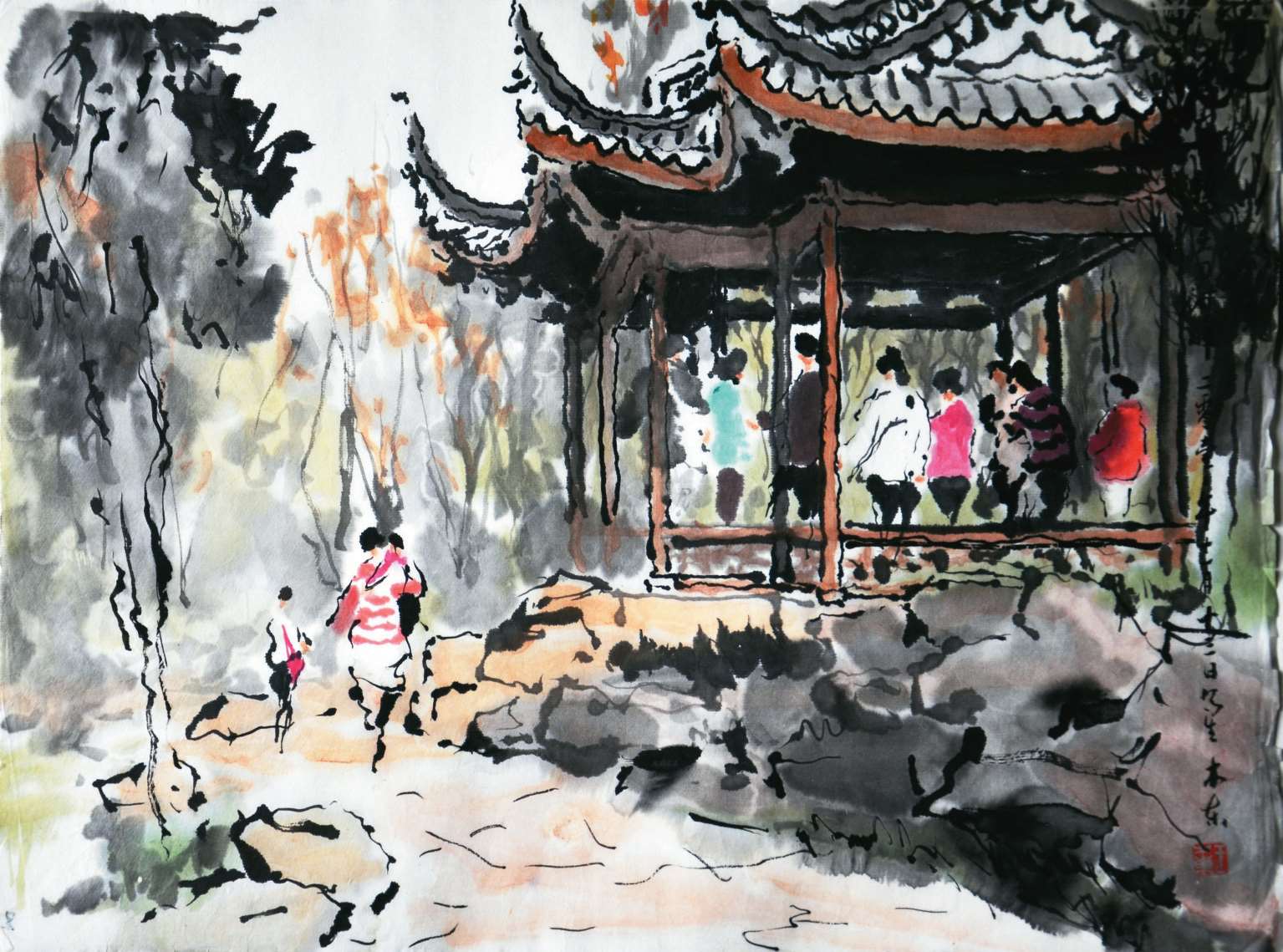 这幅画,一望可知,是美丽的江南山水园林一角,是修建后的惠山古镇一景。王老认为“这是一个比较美观的亭子”,他说:“从这里看前面的九峰翠嶂石坊,风景很好。关刀河广场(西神广场),吴惠良局长(原园林局长,负责古镇恢复工程者)做得很成功。有些老人认为古镇是假的,但原来的古镇我住了六十年,那种破落的情况让人无法称赞。任何事情都不是十全十美的,古镇今天是假的,百年之后就是真的了,恢复比不恢复强。”