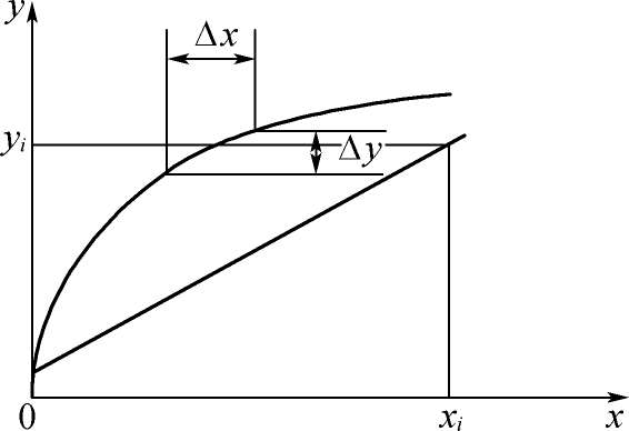 ④独立线性度:作两条与端基直线平行的直线,使之恰好包围所有的标定点,以与二直线等距离的直线作为拟合直线。
