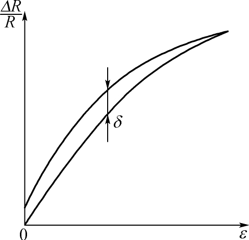 贴有应变计的试件进行加载和卸载时,其Δ R / R ~ ε 特性曲线不重合。把加载和卸载特性曲线的最大差值 δ ,称为应变计的机械滞后值,如图2-9所示。
