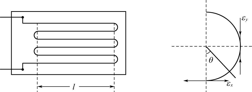 敏感栅由许多直线及圆角组成,如图2-5所示。拉伸被测试件时,粘贴在试件上的应变计,被沿应变计长度方向拉伸,产生纵向拉伸应变 ε x ,应变计直线段电阻将增加。但是在圆弧段上,沿各微段(圆弧的切向)的应变并不是 ε x ,与直线段上同样长的微段所产生的电阻变化不同。