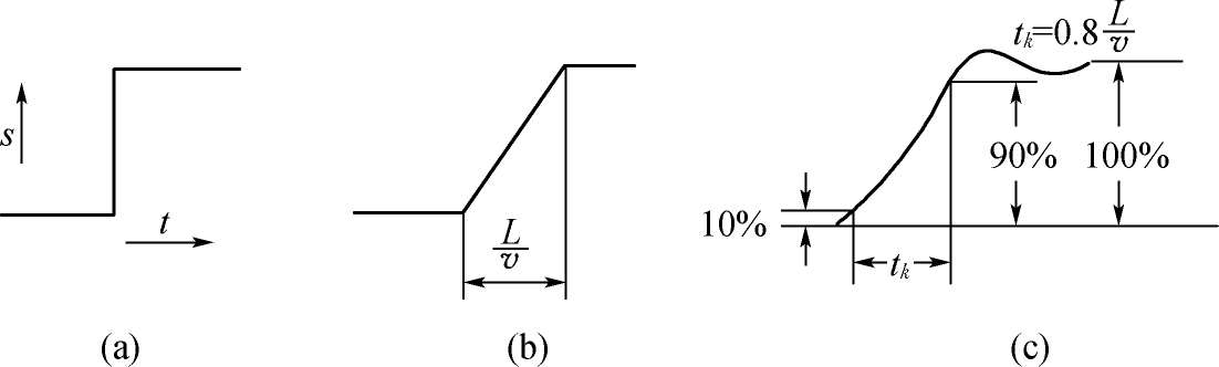 图2-6(a)的阶跃波沿敏感栅轴向传播时,由于应变波通过敏感栅需要一定时间,当阶跃波的跃起部分通过敏感栅全部长度后,电阻变化才达到最大值。应变计的理论响应特性如图2-6(b)所示。由于应变计粘合层对应变中高次谐波的衰减作用,实际波形如图2-6(c)所示。如以输出从最大值的10%上升到90%的这段时间为上升时间,则