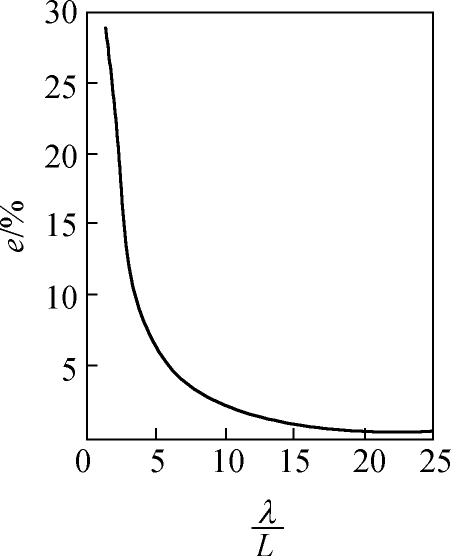 由上式可知,测量误差 e 与应变波长对基长的相对比值 n = λ / L 有关,其关系曲线如图2-8所示。 λ / L 愈大,误差 e 愈小。一般可取 λ / L =10~20,其误差 e 小于1.6%~0.4%。又有 f = v /( nL ),即 n 愈大,工作频率愈高。