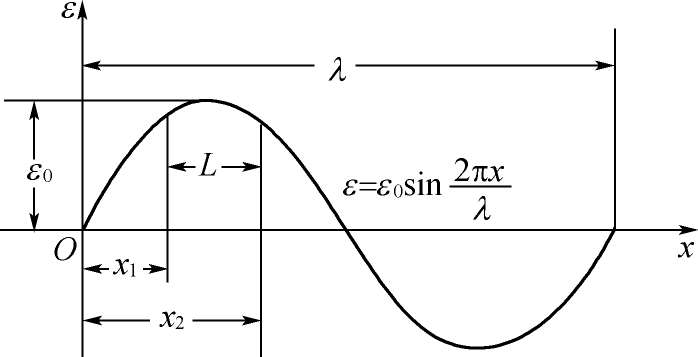 当测量按正弦规律变化的应变波时,由于应变计反映的应变波形,是应变计线栅长度内所感受应变量的平均值,因此应变计反应的波幅将低于真实应变波,从而带来一定误差。显然,这种误差将随应变计基长的增加而加大。当基片一定时将随频率的增加而加大。图2-7表示应变计正处于应变波达到最大值时的瞬时情况。应变波的波长为 λ ,应变计的基长为 L ,两端点的坐标为 x 1 和 x 2 ,而 x 1 = λ /4- L /2, x 2 = λ /4+ L /2,此时应变计在其基长 L 内测得的平均应变 ε p 达到最大值。