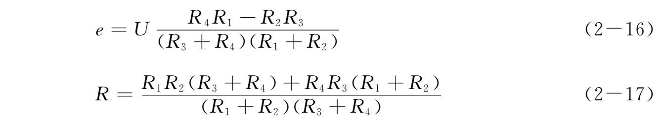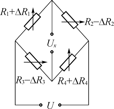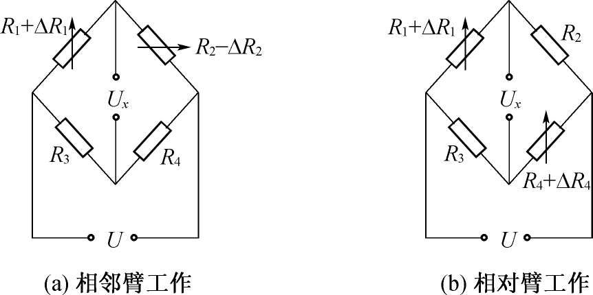 当相邻臂工作时,如图2-17所示,一臂为 R 1 +Δ R 1 ,另一臂为 R 2 +Δ R 2 ,由于 R 1 = R 2 = R 3 = R 4 = R ,而Δ R 1 =Δ R 2 =Δ R ,所以