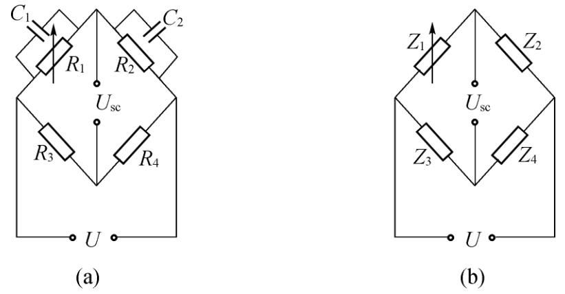 当采用交流供桥载波放大时,应变电桥也需交流电源供电。应变电桥各臂一般是由应变计或无感精密电阻组成,是纯电阻电桥。但在交流电源供电时,需要考虑分布电容的影响,这相当于应变计并联一个电容,如图2-19(a)所示。此时桥臂已不是纯电阻性的,这就需要分析各桥臂均为复阻抗时一般形式的交流电桥。交流电桥的一般形式如图2-19(b)所示,其中 Z 1 、 Z 2 、 Z 3 、 Z 4 为复阻抗。其电源电压、输出电压均应用复数表示。
