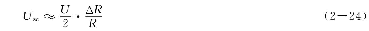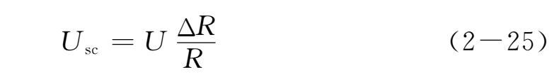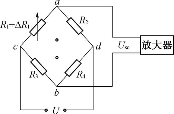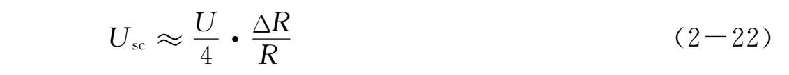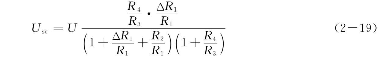 电阻应变计工作时,其电阻变化很微小。例如,一片 k =2,初始电阻120Ω的应变计,受到1000微应变时,其电阻变化仅0.24Ω。引起的不平衡电压极小,不能用它来直接推动指示仪表,故需加以放大。这时感兴趣的是电桥输出电压。一般放大器的输入阻抗较电桥的内阻要高得多,可认为电桥输出端处于开路状态。如图2-15所示,设 R 1 为电桥工作臂,受应变时,其电阻变化为Δ R 1 , R 2 、 R 3 、 R 4 均为固定桥臂。在起始时,电桥处于平衡状态,此时 U sc =0。当有Δ R 1 时,电桥输出电压为