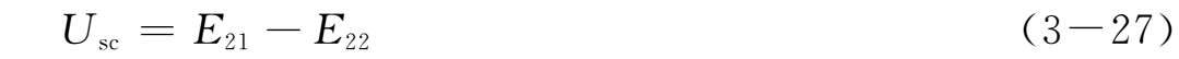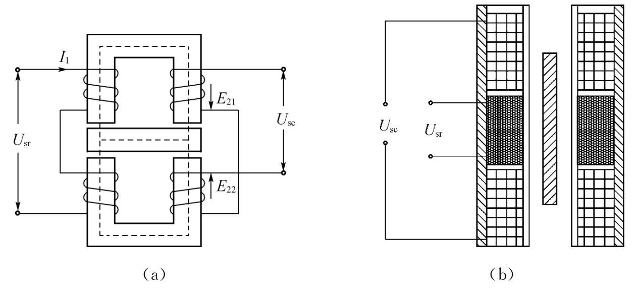 由于互感,初级线圈的交流信号在两个次级线圈上分别产生感应电动势 E 21 和 E 22 ,又因接成差动形式,即两个感应电动势反向串联,则输出电压为